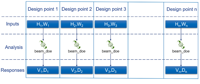 For the beam example, let’s say we create a design using two input variables (H, W) and then evaluate the two responses (V, D) for each design point. The flow chart would look something like this: