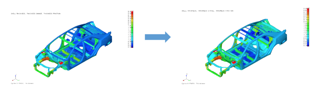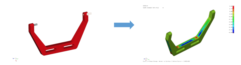 Figure 3, on the left, shows the initial design space and on the right, it shows the final design. Topometry optimization designed here every element thickness of the structure. Note that the horizontal “arms” on the final results are tapered while the arms in the initial design were uniform. The final topometry design is 10% lighter than the initial design which itself was previously optimized using sizing optimization.
