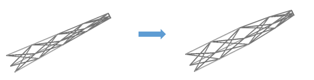 Figure 4, on the left, shows the initial design of a truss structure and on the right, it shows the final and optimal design. Shape optimization designed the location of certain grids of the structure. The figure shows that the final result is wider than the original design.