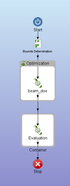 For example, in the workflow shown above, the bounds and initial values for an optimization component are determined by a python script and the optimal point is supplied to the next analysis.