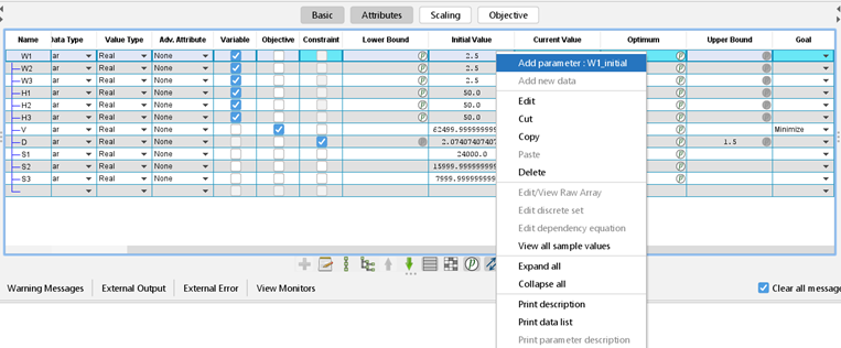2. Next, we want to transfer these values to the corresponding variables inside the optimization component. First, we enable the parameters option by clicking on the button in the toolbar below the component editor table inside the optimization component.