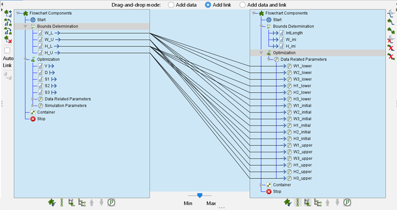 4. We repeat the procedure for transferring data between the optimization component and the last evaluation component. The complete set of data linkages is displayed below:
