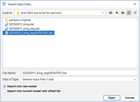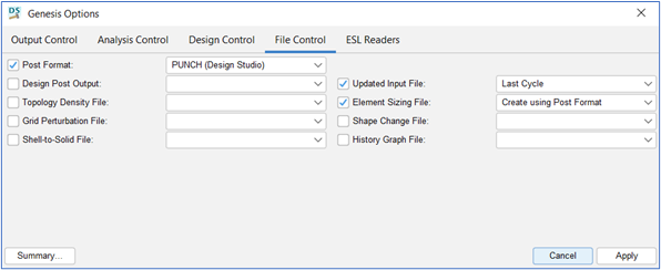 Once these are created on the original un-optimized model, add “original” to the name of each of these three in the project directory so they won’t be overwritten by the script when this is also done for the optimized model. When you are ready to optimize a model, go to Genesis Options, File Control tab and find the Updated Input File option at the top of the right column.  Activate this and set it to Last Cycle in the pulldown.  This will cause Genesis to output a dat file of the optimized model configuration after optimization is finished.